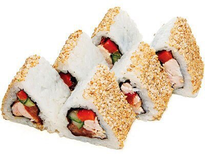 4. Разрезать ролл на 6 частей и съесть. Подается с соусом Терияки.