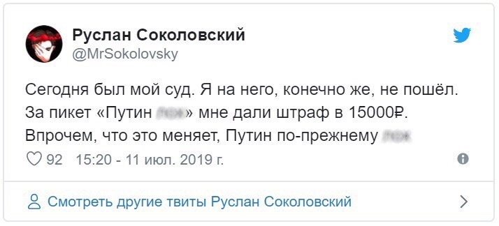 Недавно Руслана задержали на Красной площади: в руках он держал плакат, на котором была не очень положительная характеристика главы государства. Естественно, Соколовскому дали штраф за оскорбление властей.