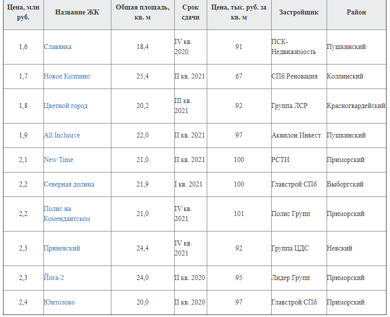 Еще в начале этого года самую дешевую студию с петербургской пропиской и на стадии котлована можно было найти за полтора миллиона рублей. Но ажиотаж накануне 1 июля взвинтил для покупателя стоимость входного билета на рынок новостроек. Билютень недвижимости (сайт с очень толковой аналитикой) составил топ-10 самых доступных по цене квартир в Петербурге, которые застройщики предлагают после перехода рынка новостроек на новые правила 214-ФЗ Дешевые студии с петербургской пропиской сейчас предлагаются в новостройках Колпино (ЖК «Новое Колпино» от «СПб Реновации»), Шушарах (ЖК Славянка от компании «ПСК-Недвижимость») или бывших совхозных полях Красногвардейского района (ЖК «Цветной город» от «Группы ЛСР»). В традиционных городских спальниках квартиру стоимостью ниже 2 млн руб. уже не отыскать. Впрочем, прибавив пару сотен тысяч, можно приобрести компактную по площади студию в Приморском, Выборгском или Невском районе. Отметим, что, несмотря на ценовой рост, Приморский район по-прежнем
