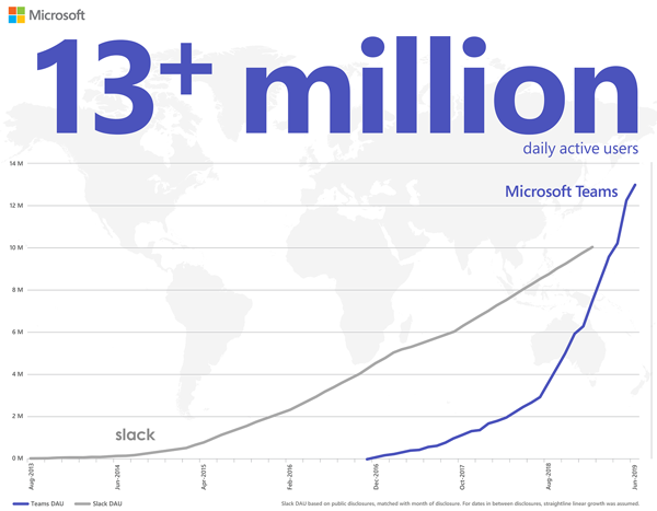 Аудитория коммуникационной платформы Microsoft Teams, предназначенной для повышения эффективности взаимодействия сотрудников в корпоративной среде, превысила 13 миллионов человек в сутки и 19 млн пользователей в неделю. Об этом говорится в информационном сообщении софтверного гиганта. Microsoft Teams создана для совместной работы сотрудников компаний, интегрирована с приложениями Office 365 и позиционируется в качестве рабочего инструмента для корпоративного взаимодействия. Пользователи сервиса могут объединяться в команды, внутри которых можно создавать открытые каналы для групп или общаться через личные сообщения, обмениваться документами и проводить виртуальные конференции. Глобальный запуск Microsoft Teams состоялся в марте 2017 года. На данный момент сервисом пользуются свыше 500 тысяч предприятий по всему миру, включая 91 компанию из списка Fortune 100. В их числе — Emirates, FedEx, Lexmark, The Adecco Group, KONE, McCann Worldgroup, Cerner, Cox Automotive, dm-drogerie markt, Dr.