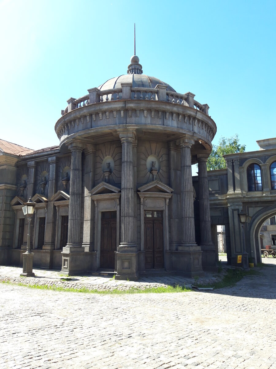 Очень необычно, идти-идти по территории Мосфильма и очутиться в Санкт-Петербурге 19 века. Нет, на Мосфильме нет машины времени, а есть павильон под открытым небом "Старая Москва-Санкт-Петербург". Построен он был для съемок фильма "Всадник по имени смерть" Карена Шахназарова( фильм не помню, мимо меня прошел). После съемок картины декорации разбирать не стали, наоборот, добавили ещё зданий. Сами здания из картона, очень тоненькие. Внутри них ничего нет, снимают только уличные сцены. И вот ведь, глядя вблизи понимаешь, что обманка, а видя потом фотографии, не отличишь от настоящих. Вот так нас и обманывают киношники. Погулять по улочкам интересно, видишь знакомые по фильмам здания Далеко нас не пустили, рабочие разбирали одни и ставили другие декорации, готовя павильон к съемкам нового фильма(узнать бы какого, чтобы потом смотреть его и говорить всем- я тут была). Мы покидаем старую Москву и переносимся в современный мир. Новый павильон "Chroma key", в котором снимают на зеленом фон