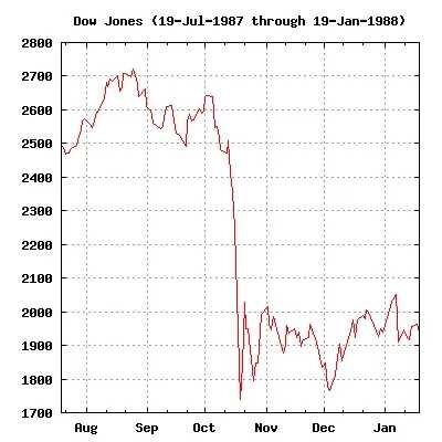 Чёрный понедельник (англ. Black Monday) — понедельник 19 октября1987 года — день, в который произошло самое большое падение Промышленного индекса Доу-Джонса за всю его историю, — 22,6 %. Это событие затронуло не только США, а быстро распространилось по всему миру. Так, фондовые биржи Австралиипотеряли к концу октября 41,8 %, Канады — 22,5 %, Гонконга — 45,8 %, Великобритании — 26,4 %.