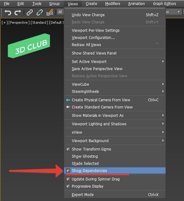 Знакома ли вам ситуация, когда вы изменили объект, забыв, что это инстанс, и неожиданно в сцене изменилось что-то еще? Оказывается, все инстансы объекта можно автоматически подсветить во вьюпорте. Для этого в верхнем меню Views нужно включить галочку Show Dependencies. Кстати, если в стеке вы выбрали модификатор, то подсветятся все объекты, на которые этот модификатор влияет.