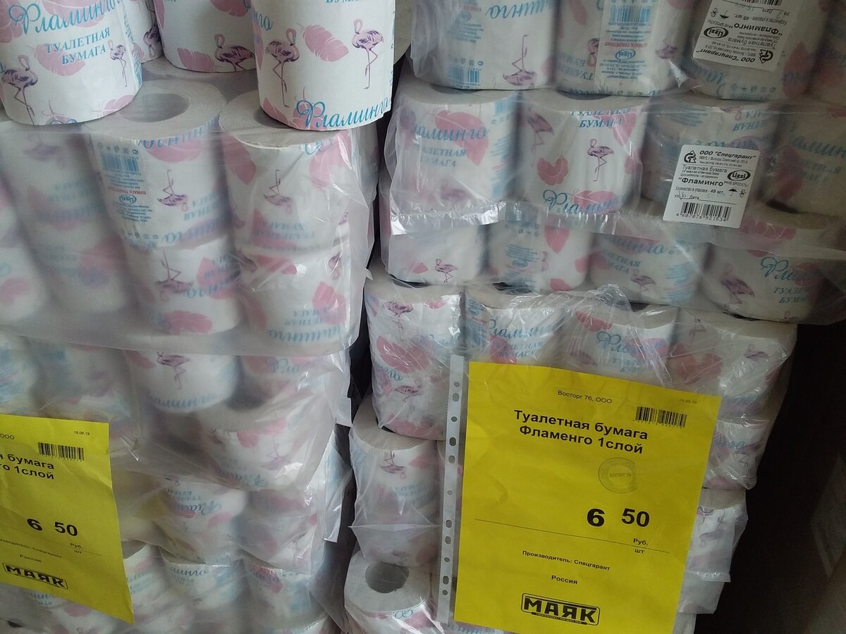 Почему на ум пришла тема про туалетную бумагу? Да просто гуляя на днях по Маяку (это аналог Светофора у нас в городе), куда мы заехали специально за дешёвым стиральным порошком, я увидела несколько человек, бросающих в тележки по 2-3 большие упаковки с рулонами по 4-8 штук. В этом не было бы ничего удивительного, если б не цена пачек и качество этого чуть ли не жизненно необходимого в быту товара. Специально рассмотрела стоящие в коробках рулончики и упаковки, сфотографировала ценники. Вот примеры цен: Честно, таких цен я уже давно не видела. Ну 12, ну 15 рублей за рулон - это еще ладно, но 6,50? Прозвучит, думаю, странно, но именно дешевая цена сразу оттолкнула меня от такой вероятной покупки, и это с моей-то привычкой экономить и искать по акциям более выгодные ценники. Признаюсь - дешёвую туалетную бумагу я не покупаю. Считаю, что на этом товаре много не сэкономишь, да и не вижу смысла. Ну не стоит опускаться до унижающих любого человека подсчетов копеек и нескольких рублей, тем бол