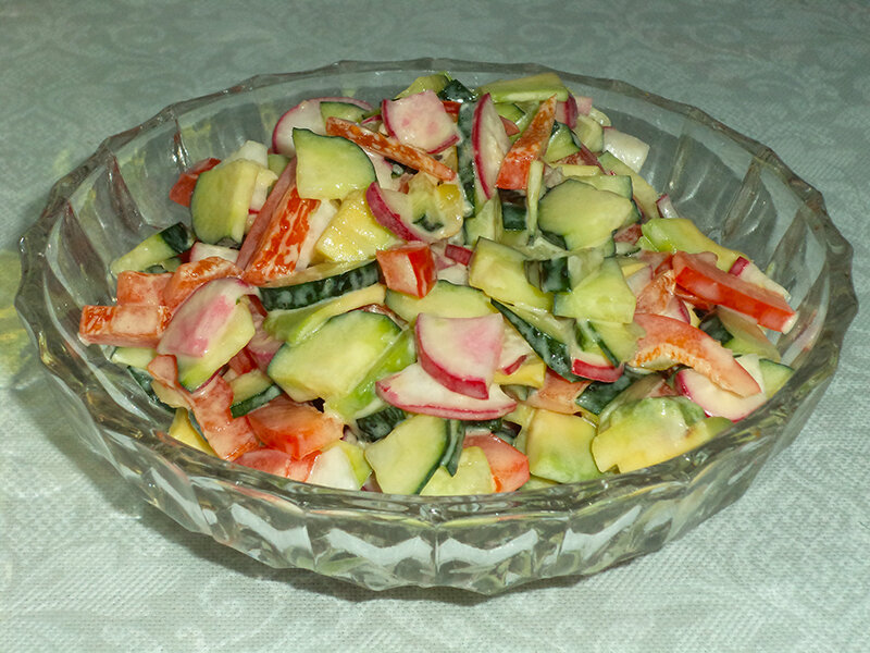 Простой, но вкусный салат, который готовится за 5 минут. Поверьте, сочность овощей, нежный вкус авокадо и сырный соус сделают этот салат одним из ваших любимых. Время приготовления – 5 минут Количество порций – 1 Что нужно для вкусного салата из овощей Как приготовить салат с сырной заправкой 1. Все овощи нарезаем, кроме чеснока. Его натираем на мелкой терке. Рекомендую выбирать яркие продукты: зеленые огурец и авокадо, красный или оранжевый перец и яркую редиску. 2. В салатнике смешиваем ингредиенты, добавив соль и сырный соус. Перемешиваем. 3. Вот и все – салат готов. Прелесть такого салата в простоте, скорости приготовления и приятном внешнем виде. В отличие от салатов с помидорами, он не «побежит» и не утратит свой внешний вид. Приятного аппетита! Чтобы не пропустить новые рецепты, ставьте 👍 и подписывайтесь на Poperchi.Ru!