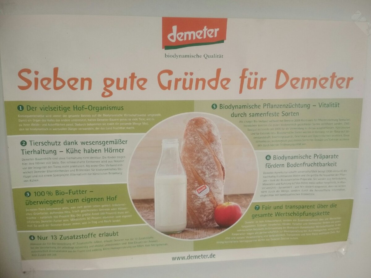 Сегодня весь день был в пекарне. Просил босса посмотреть другие участки и вот сегодня пошёл в пекарню. Лейбл биодинамической ассоциации Demeter повсюду. Постеры, фартуки, пакеты для хлеба, идеология пекаря. Подробнее про биодинамическую сертификацию для пекарен Demeter можно посмотреть здесь.