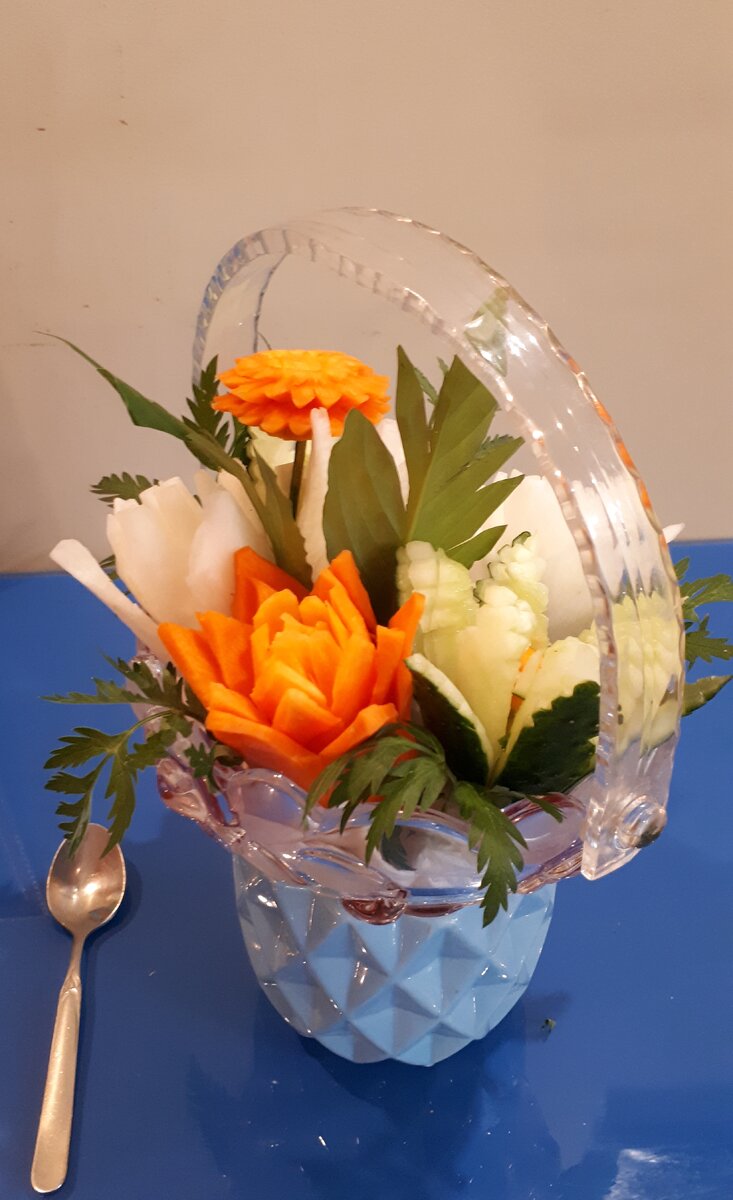 Корзина стеклянная с цветами из моркови, редьки дайкона и зеленого огурца.