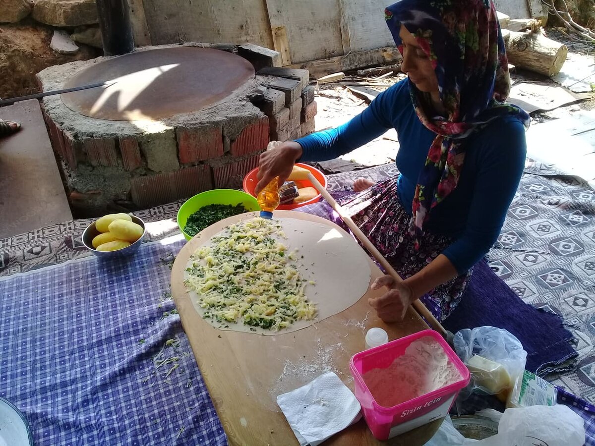 Мне пришлось не раз наблюдать, как искусно раскатывают тесто для гезлеме турецкие мастерицы. Ловко орудуют специальной длинной скалкой, мгновенно выкатывая тонкий, как бумага, круг. Половину круга заполняют начинкой. Потом его сворачивают пополам. Готовая лепешка по форме напоминает глаз. Отсюда и название -gözleme. Göz по турецки — глаз.