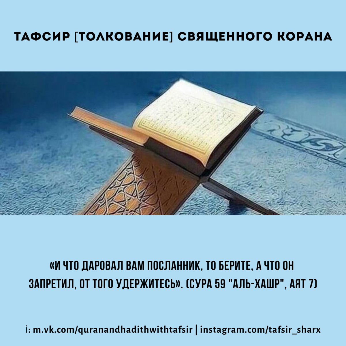 Толкование Священного Корана | «И что даровал вам Посланник, то берите, а что он запретил, от того удержитесь». (Сура 59 «Аль-Хашр», аят7) Священный Коран гласит: «И что даровал вам Посланник, то берите, а что он запретил, от того удержитесь». (59:7) Хотя в аяте идет речь о распределении военной добычи, тем не менее существует известный принцип интерпретации Священного Корана, по которому, несмотря на конкретные события по поводу которых был ниспослан аят, если затрагивается какие-либо общие понятия, то Слова Аллаха и истолковываются гораздо шире и не могут быть ограничены описываемым событием. По этому принципу, который никогда не обсуждается, аят дает нам общее правило: «Какое бы повеление Пророк (мир ему и благословение Аллаха) ни дал, оно обязательно для верующих, и какую бы вещь он ни запретил, она становится запретной для них». Таким образом, Священный Коран дарует Пророку (мир ему и благословение Аллаха) законную власть давать повеления, творить законы и делать запреты