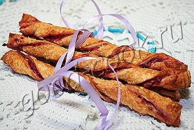 Не нужно делать малиновый слой слишком толстым, иначе пласты теста будут разъезжаться. СОСТАВ 250г слоёного теста, 100г малины, 1 ст ложка сахара (25г), 1 ст ложка с горкой крахмала (15г) или 3~4 ст ложки молотых орехов посмотреть калорийность» Малину растереть с сахаром. Вмешать крахмал или молотые орехи. Тесто раскатать в тонкий прямоугольный пласт. Разрезать тесто пополам. На одну часть теста ровным слоем намазать малиновую начинку. Накрыть сверху вторым пластом теста и слегка прижать ладонью. Нарезать на полоски шириной 1,5~2 сантиметра. Каждую полоску брать за кончики и перекручивать в спираль. Затем уложить скрученные палочки на противень, застеленный бумагой для выпечки. Выпекать при t=200~220°C 12~15 минут.