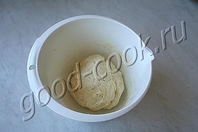 Замесить плотное, чуть липкое тесто. Если тесто будет чрезмерно липким, добавить ещё немного муки. Положить тесто в холодильник до небольшого затвердения.