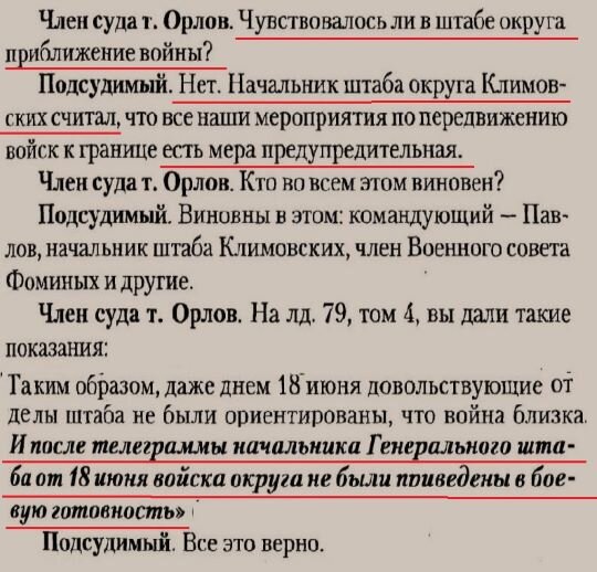 Читая протоколы допроса Павлова и других подсудимых понимаешь, выполни четко и безукоризненно приказы Наркома обороны и многих бессмысленных потерь можно было избежать. Вот выдержка из протокола допроса начальника связи Западного фронта Григорьева: Еще 18 июня во все военные округа поступила директива с подробным планом и руководством по обороне