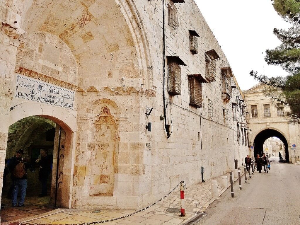 Вход в Армянскую Патриархию и монастырь Св.Иаковов через массивные ворота (обратите внимание, какие эти ворота древние) под вывеской "Convent Armenien", после чего вы сразу попадаете в церковный дворик перед церковью Св.Иаковов -
