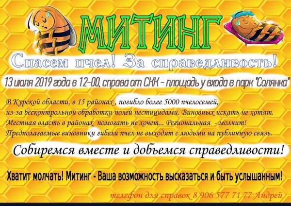 В субботу на территории региона будут проводиться сразу несколько митингов. Самый массовый из них пройдет в областном центре. Там заявлено мероприятие, численностью до пятисот человек. С протестом выйдут пчеловоды. Известно, что пострадавшими от массовой гибели пчел стали 300 пчеловодов из 15 районов облоасти. Из-за бесконтрольной обработки полей гербицидами, весной и в начале лета, погибло более 5 тысяч пчелосемей. Митинг пройдет 13 июля, в 12 часов в парке Солянка. А в Курчатове протестуют представители КПРФ. Митинг на главной площади коммунисты приурочили в защиту совхоза имени Ленина, который принадлежит Павлу Грудинину.
