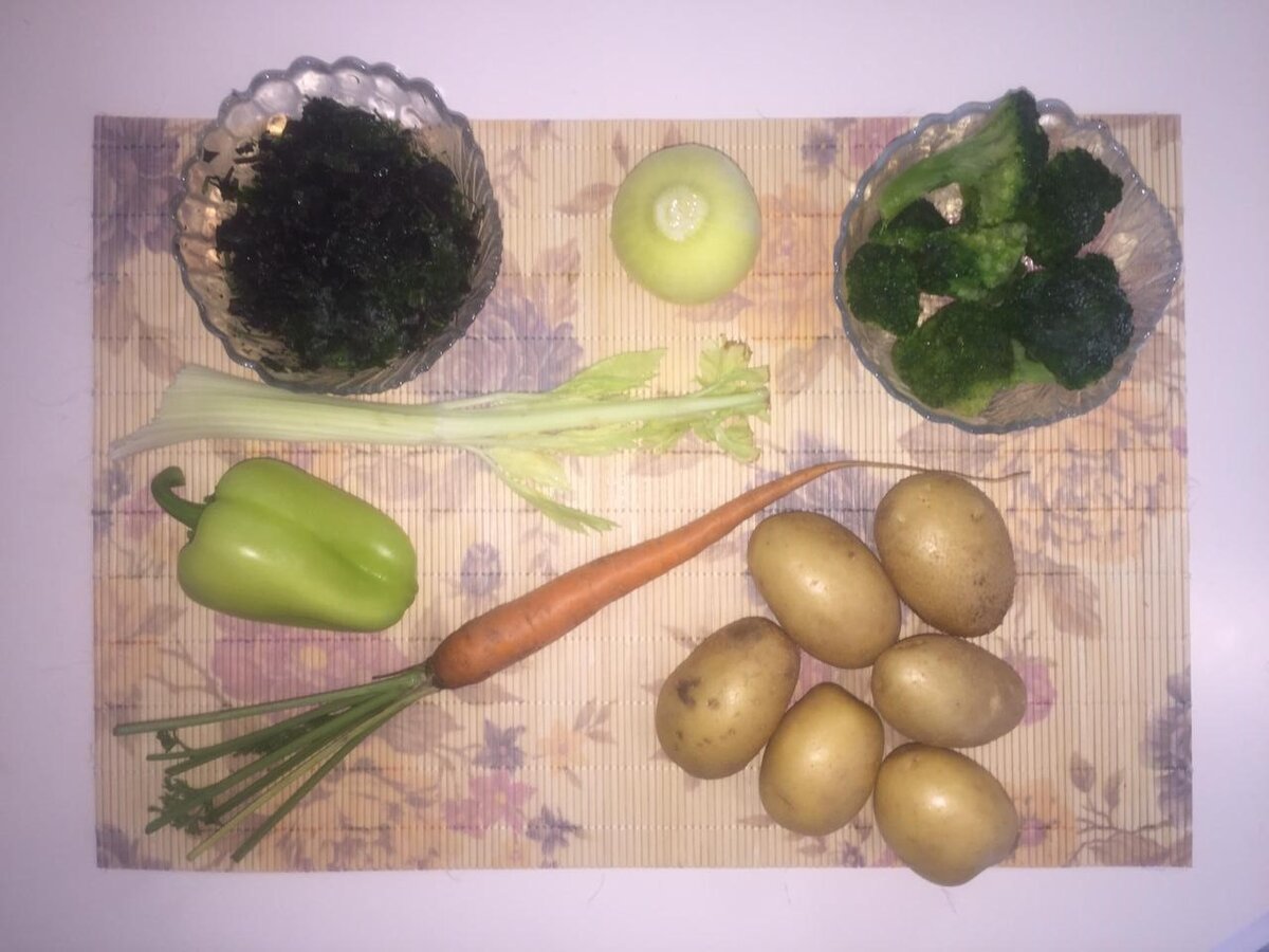 Этот суп получается просто отличным: лёгким, и при этом наваристым, вкусным, но не жирным. Как всегда, в конце – калькуляция стоимости продуктов и расчёт стоимости готового супа. Я не обжаривал овощи в масле, поэтому, чтобы суп не получился пресным, использовал куриный бульон. Можно делать без курицы, но тогда лучше обжарить овощи. Что я использовал: Курица – 187 гр. Картофель – 6 маленьких клубней Морковь – 1 шт. маленькая Брокколи – несколько соцветий (148 гр.) Болгарский перец – 1 шт. Луковица – 1 шт. Зелень петрушки и базилика – 1 пучок Сельдерей – 1 корешок Вода – 3 литра Соль. Брокколи я взял ещё из зимних запасов, из морозильника. Покупал в «Магните» по 99 руб. за кг, но, сейчас и свежая примерно столько стоит. Базилик и петрушка тоже замороженные. Лук, морковь и картофель – свежего урожая. Никаких специй не клал – сельдерей и базилик и так достаточно пряные. Для бульона я взял куриную кость и кожу с грудки. Филе я вырезал для другого блюда, а вот эти остатки разумно использоват