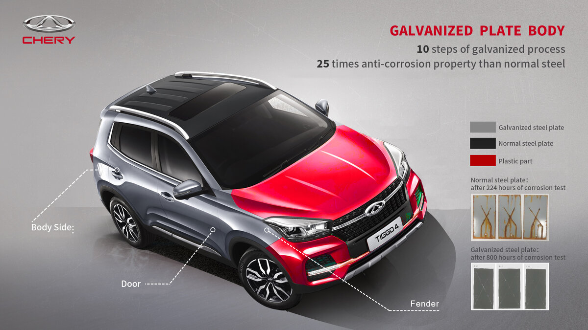Автомобили концерна CHERY представлены более чем в 80 регионах по всему миру — Восточной Европе, Центральной и Южной Америке, Ближнем Востоке, Африке и Азии. Россия станет первой страной за пределами Китая, в которой будет представлен кроссовер TIGGO 4 нового поколения. Модель адаптирована к российским климатическим и дорожным условиям. Приобрести кроссовер можно будет уже в августе этого года у официальных дилеров марки CHERY. При изготовлении кузова Chery Tiggo 4 используется высококачественная оцинкованная сталь с низким содержанием углерода, обладающая высокой стойкостью к коррозии. Перед покраской для дополнительной защиты от коррозии, улучшения твердости и износостойкости металла на корпус автомобиля наносится слой грунта на основе фосфата цинка. Применение технологии фосфатирования также способствует увеличению долговечности лакокрасочного покрытия. Такой подход к процессу производства и подготовки кузовов Tiggo 4 позволяет производителю дать гарантию на автомобиль сроком 5 ле