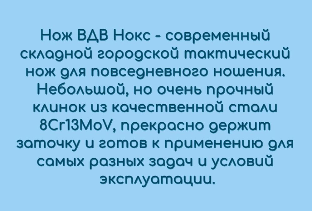 Замок Четким и плавным открытием нож обязан наличию подшипников в осевом узле. Нож можно открыть с помощью двустороннего шпенька, либо за выступ-флиппер, который в открытом положении исполняет роль гарды. Производитель - НОКС