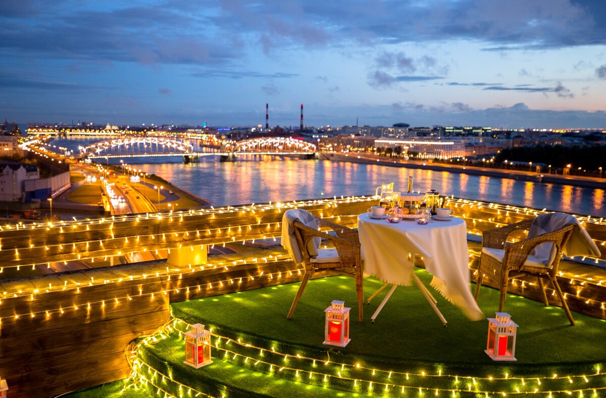 Я не особый любитель ужинов при свечах, прогулок под луной и прочей избитой романтики. Но не так давно коллеги подарили мне поход на свидание на крыше и — внезапно — мне понравилось. Вот так выглядел мой сертификат. В день "икс" мы отправились в гостиницу "Охтинская": именно там находится крыша. На ресепшн нас встретил молодой человек в спортивной одежде и провел на тринадцатый этаж. Пейзаж открылся захватывающий: на Неву, Свердловскую набережную, Смольный собор и Большеохтинский мост. Если быть точной, свидание проходит не на крыше, а на просторной огороженной террасе: ее площадь, наверное, метров 70. Справа расположен шатер ярко-алого цвета и телескоп. В него можно рассмотреть даже номера машин, проезжающих по набережной. В шатре стоит диван с подушками и скромные угощения: недорогое шампанское (Санто Стефано), конфеты рафаэлло, а также бананы, грейпфруты и груши в двух экземплярах. В колонках играет романтическая зарубежная музыка (Фрэнк Синатра, Робби Уильямс, Шер и т.д.
