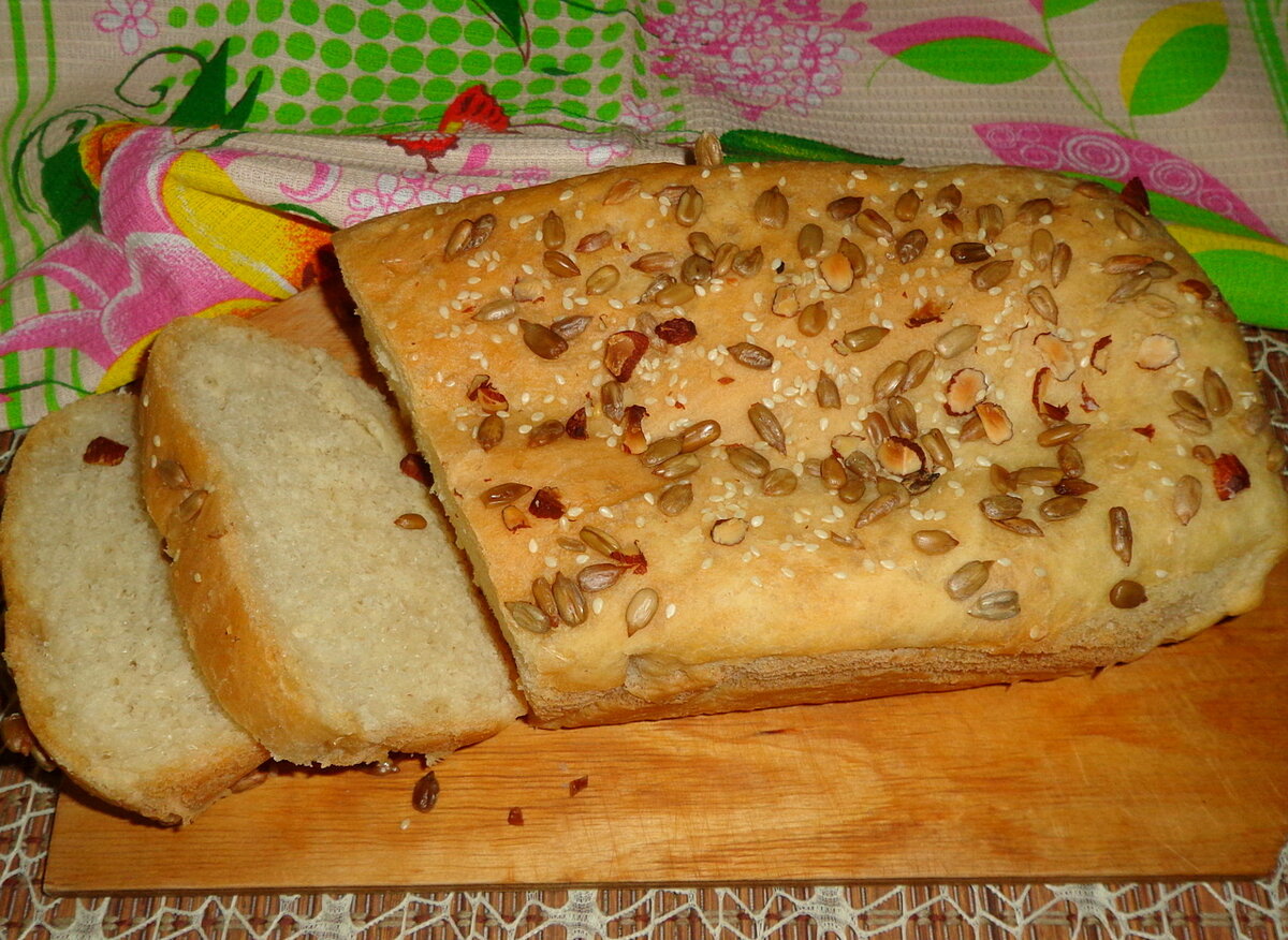 ИНГРЕДИЕНТЫ: Мука пшеничная.................................450 гр. Дрожжи сухие.....................................1 ч. ложка Соль.......................................................1 ч. ложка Сахар.....................................................2 ч. ложки Вода теплая..........................................250-300 мл. Семечки подсолнечника....................50 гр. Семена льна.........................................50 гр. Подсолнечное масло..........................для смазывания формы ПРИГОТОВЛЕНИЕ: 1. В миску с теплой водой насыпаем соль, дрожжи и сахар, перемешиваем