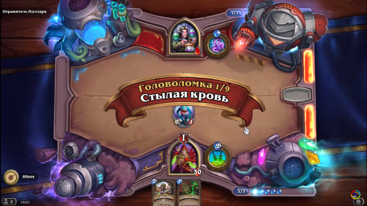 Проходим первого босса Отравитель Полларк в головоломке HearthStone Проект Бумного дня Смерть. Отравитель Полларк Головоломка 1/9 – Стылая кровь Головоломка 2/9 — Обморожение Головоломка 3/9 – Боевой вепрь Головоломка 4/9 – Держись рядом Головоломка 5/9 – Разъяренные бойцы Головоломка 6/9 – Возвращение Лироя Головоломка 7/9 – Космический огонь Головоломка 8/9 – Натянутая тетива Головоломка 9/9 – Запасной план 1. Даже думать не надо, берете и бьёте планом "Б", после чего наслаждаетесь победой.