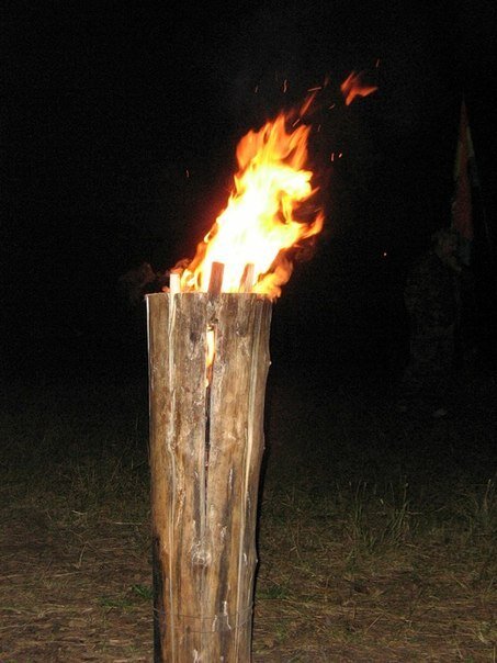 Что же такое таежная свеча? Таежная свеча- это одна из разновидностей дровяных примусов. Она не требует большого количества дров и легка в изготовлении. К плюсам таежной свечи можно отнести то, что горит она при любых метеорологических условиях: дождь, снег или сильный ветер. Что бы изготовить таежную свечу необходимо полено без сучков из хвойной породы дерева. Длина полена должна быть 40-45 см и в сечении 25 см. Полено раскалывается на 4 равные части, потом откалываем внутреннюю часть полена, которая далее колется на мелкие щепки для розжига. А также нам необходимо найти 4 прямых, не сухих ветви. Далее мы переходим к процессу «сборки». Сначала снизу кладем ветки на крестом как на картинке, фиксируем низ и вверх проволокой, а в центр накладываем сухие щепки. Вот наша свеча и готова! Необходимо поджигать ее снизу и она сразу начнет разгораться. Горит «таежная свеча» до 1,5 часа. Следовательно вы успеете и приготовить кушать, а также согреться и при необходимости просушить одежд