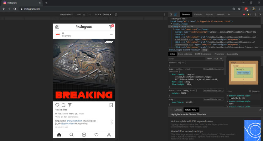 Инстаграмм - это одна из самых популярных социальных сетей в мире. Её используют почти все и не важно, сколько человеку лет. Вероятно каждый активный пользователь Инсты у которого есть компьютер когда-то пытался запостить что-нибудь со своего ПК, но сделать это не удавалось, ведь кнопки, позволяющей это сделать, на оффициальном сайте просто нет! Мы перерыли весь интернет и нашли три безотказных способа всё-таки сделать публикацию в вашей любимой социальной сети. 1. Используя панель разработчика Один из самых простых способов - это просто заставить сайт думать, что вы зашли с телефона Lumia, на котором можно делать посты через веб версию. Чтобы этого добиться нужно использовать панель разрабочика. Это выглядит и звучит довольно сложно, но на самом деле вам нужно сделать лишь пару кликов, следуя нашим указаниям. В браузере Google Chrome нужно сначала нажать на кнопку F12 (это откроет панель), после на нжать иконку с тремя точками (расположены они вертикально, как светофор), в открывшемс