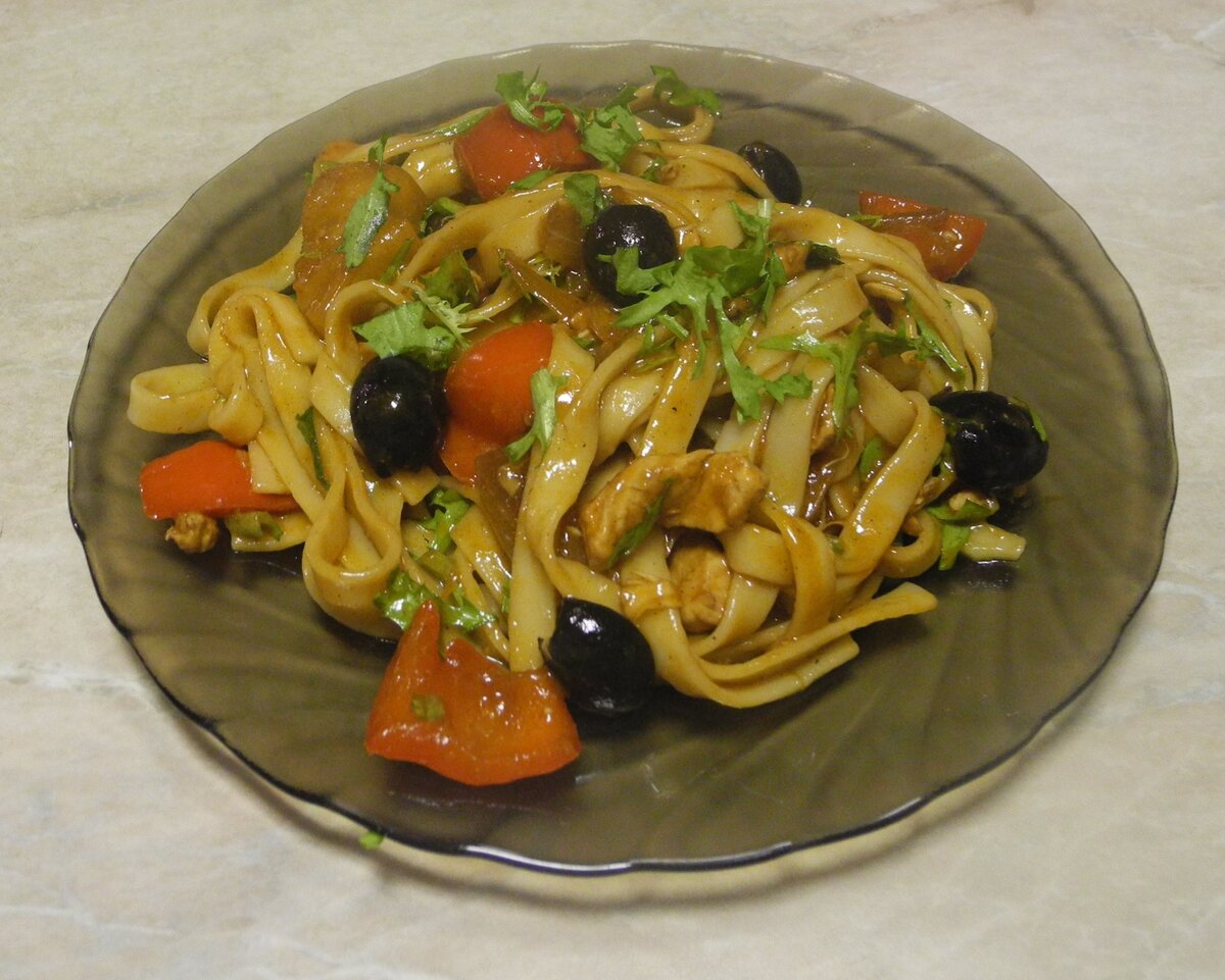 Размышляете, что приготовить на ужин? Приготовьте лапшу удон с курицей и ананасами. У меня этот рецепт прижился. Получается вкусно и готовить быстро. Иногда вместо удона беру обычную пасту, но сегодня готовила именно удон. Для приготовления на две порции понадобится: 1. лапша удон 2. половина куриной грудки 3. перец сладкий красный 4. ананас( замороженный) 2-3 кружочка 5. лук репчатый 1шт 6. зелень 7. соевый соус 2-3 ст. л 8. крахмал кукурузный 1 ч.л 9. томат 1ч.л 10. соль, сахар, сок лимона, имбирь по вкусу 11. масло растительное 4 ст.л 12. маслины 1/3 б Куриную грудку режем тонкими ломтиками и обжариваем в разогретом масле быстро. Конечно, лучше всего готовить в воке, но если нет вока- готовим в обычной сковороде с высокими бортами. Убираем обжаренную грудку. Добавляем немного масла и обжариваем вместе лук и перец, не пережариваем-овощи должны немного похрустывать. К готовым овощам выкладываем грудку, ананасы (нарезать ломтиками) добавляем томат, соевый соус, немного воды ( 1/