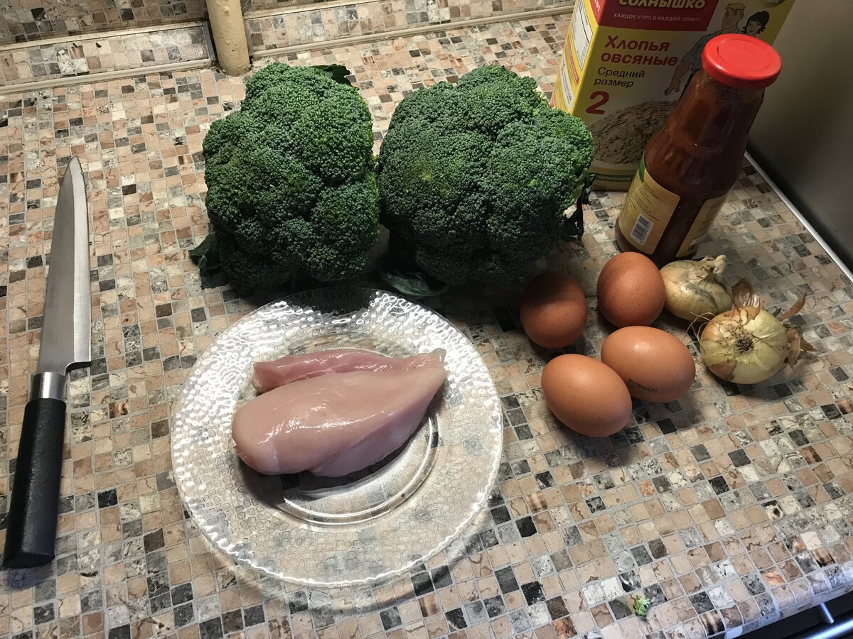 Привет друзья! Сижу, знаете ли, на своей рельефной диете и пускаю слюни от одной лишь мысли о пицце/бургере/шаурме со стаканом холодной кока колы... Но хватит это терпеть! Пора собрать остатки своего ума, который от сокращения углеводов ушёл в пешее эротическое, и придумать диетическую пиццу. Согласно моей диете - обед самый важный приём пищи, на который необходимо съесть долгие углеводы, белок и клетчатку. Именно из этих рекомендаций сложился состав моей пиццы. Для пиццы без муки понадобится: свежая брокколи, яйца, куриное филе, лук, томатный соус, овсяные хлопья, оливки и оливковое масло. Если у вас есть время на приготовления томатного соуса, то сделайте его сами. Покупные соуса как правило не вкусные. И никогда не берите соус из вкусвилла - отвратительная гадость. С ним пришлось поморочиться. Самое важное в этой пицце - основа. Именно ей я уделю особое внимание, а начинку вы уже можете придумать свою исходя из ваших вкусовых предпочтений. Основа пиццы без муки. Берем брокколи, хо