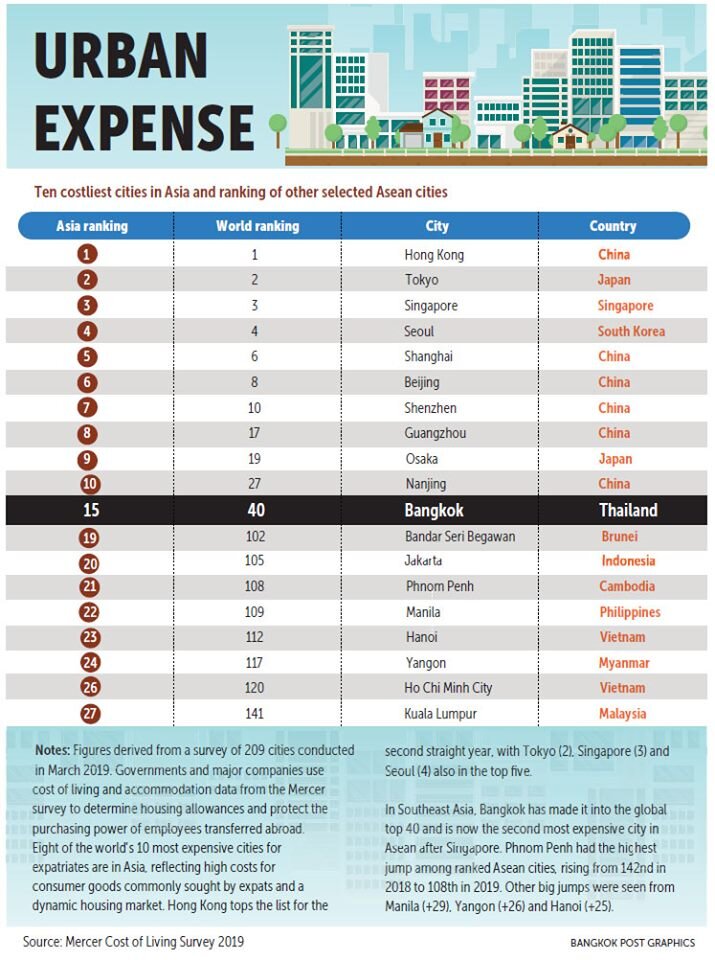 "Бангкок-пост" опубликовал интересный рейтинг. По нему видно, что Бангкок по дорогивизне — 40-й в мире и 15-й в Азии. В основном здесь дорогое жильё, цена на которое растёт из года в год. Среднияя стоимость небольшой квартиры-студии выше, чем в Москве, в районе 6-10 миллионов рублей. В остальных планах — еда, отели, развлечения — Бангкок очень дешев, бюджетное место. Интересно, что столица Камбоджи (Пном Пен) в этом рейтинге находится недалеко, даже обойдя по дороговизне столицу Малайзии (Куала Лумпур).