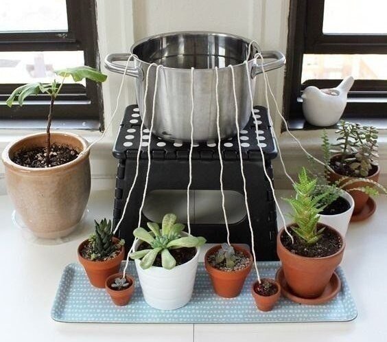 Надеюсь, и Вы найдете много интересных идей! На большой площади я ставлю устойчивый стульчик, а на него объемную кастрюлю с водой. Далее нужно разрезать на длинные отрезки толстую нить. Количество отрезков должно быть равно количеству комнатных растений. Затем все эти отрезки я погружаю в кастрюлю, после того как они размокнут нужно поштучно закопать по одному концу каждого отрезка в горшок.