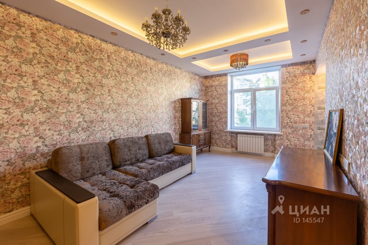 Владельцы квартиры называют ремонт в стиле «вырви глаз» стильным дизайнерским, и хотят получить за месяц аренды больше 100 тысяч рублей. Но цену может оправдать только расположение «сталинке» на Фрунзенской набережной. Всё остальное – от обоев в цветочек до плитки в имперском стиле – стоит выкинуть сразу же! Обои в цветочек сами по себе имеют право на существование. Важно, использованы ли они на всех стенах или только в качестве акцента, насколько плотный рисунок, и насколько часто он повторяется. В этом случае не избежать ощущения, что стены сжимаются вокруг и давят на человека, находящегося в комнате. Прихожая и гостиная объединены, но зонированы при помощи обоев. Здесь вполне реально установить большой встроенный шкаф во всю стену. Туда бы уместилась верхняя одежда и бытовые приспособления, а для доступа к щитку можно было предусмотреть специальный лючок изнутри шкафа. Дизайнеры не стали усложнять и просто купили шкаф с фасадом из зеркального черного стекла с раскладкой. Спас