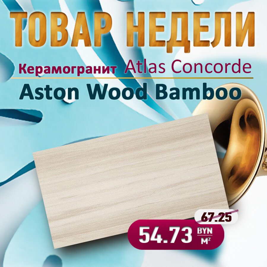 На этой неделе для Вас предоставляется керамогранит итальянского производителя: Atlas Concorde Aston Wood Bamboo Коллекция Atlas Concorde Aston Wood (Атлас Конкорд Астон Вуд) - новая универсальная серия напольного керамического гранита и керамической плитки, стилизованная под дерево, представленная на московской выставке БАТИМАТ 2015. Выразительные прожилки и характерная для дерева цветовая разнородность образуют на керамической поверхности богатый и естественный рисунок, а сама поверхность доступна в двух вариантах отделки и пяти натуральных тонах, от белого через различные оттенки коричневого до насыщенного мокко. Подробнее можете узнать на сайте: www.vsevdom.by