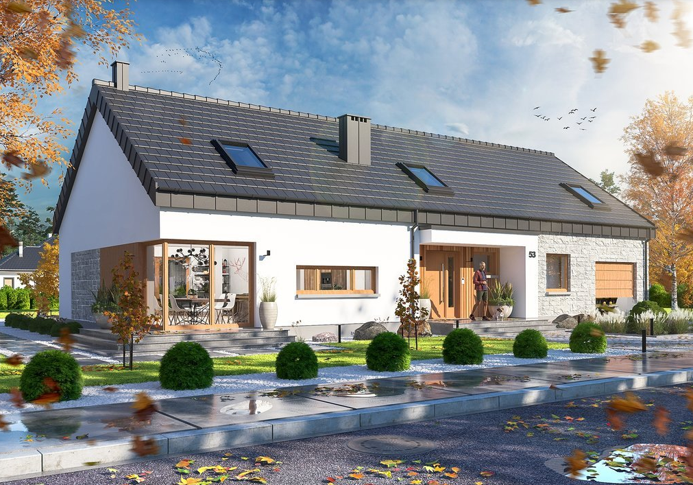 Ультрасовременный одноэтажный дом, непременно выделится среди других, более традиционных домов. Оригинальная отделка фасада, простота формы и современные окна обуславливают то, что здание будет выглядеть оригинально и свежо через много лет. Внутрь мы попадаем через большую дверь в коридор, который ведет нас к современному, хорошо спланированному открытому пространству. Здесь объединены три комнаты: гостиная, столовая и кухня. Каждая из этих комнат обеспечивает максимальный комфорт при повседневном использовании, кроме того, потолок над гостиной открыт, что еще больше усиливает впечатление большого пространства. В здании также есть 3 регулируемые комнаты: одна со своей большой ванной комнатой, прачечная, туалет, кладовая и другая ванная комната с местом для ванны и душа. Сразу за одноместным гаражом расположена большая котельная, в которой были спроектированы два типа отопления: газовое и твердое топливо. Здание спроектировано из прочного и долговечного железобетона и традиционной