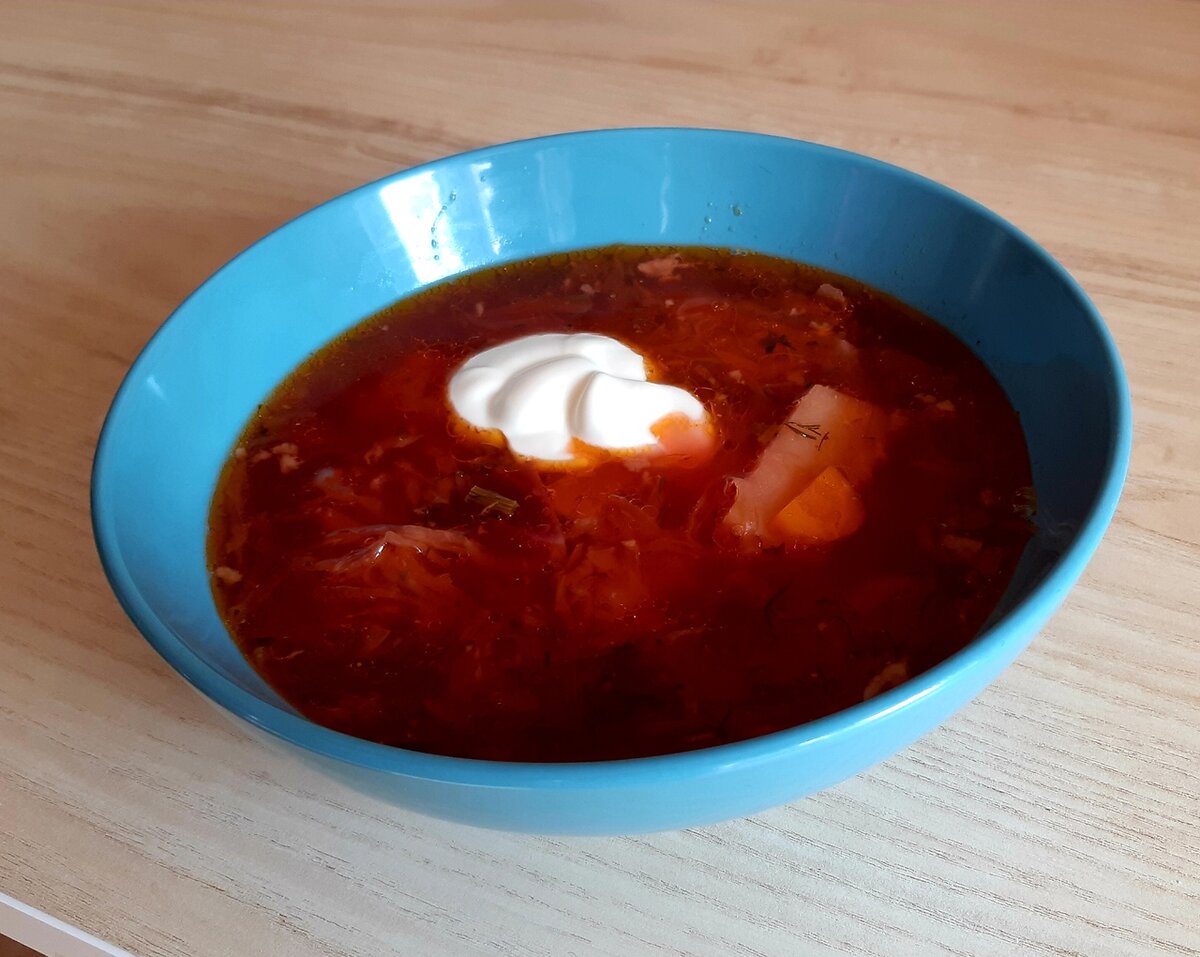 Возможно ли сварить борщ за 30-40 минут? Возможно! Сразу оговорюсь, что рецепт приготовления очень отличается от традиционного. При этом борщ получится очень вкусным, наваристым, с приятной кислинкой. Я готовлю в казане и сразу много (5 литров). Все ингредиенты в расчете на такой объем. Если у вас нет его, то моно использовать сковороду для приготовления поджарки, а продолжить готовить в кастрюле. Итак, для начала нужно поставить кипятиться воду (2,5 литра) и почистить все овощи (список всех ингредиентов в конце рецепта): · 2 небольшие или 1 крупная морковь (нарезать тонкими полукольцами); · 1 средняя свекла (нарезать кусочками как морковь); · 1 крупная луковица (мелко накрошить); · 3 зубчика чеснока (мелко накрошить); · 5-6 средних картофелин (нарезать кусочками, которые поместятся в ложку). Обжариваем лук. Когда лук станет прозрачным, добавить к нему морковь и свеклу. Пока обжаривается лук с морковью и свеклой, мелко накрошите зелень. Я использую небольшой пучок укропа. К обжаренны