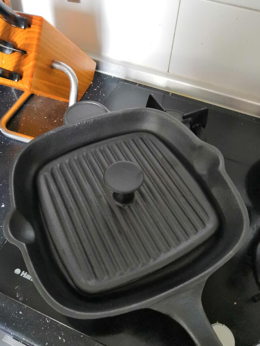 Сегодня мне пришел мой долгожданный новый "гаджет"! Будучи не очень довольным как держит температуру моя алюминиевая сковорода с "каменным" покрытием я решил обратится к "классике" и заказал себе на Беру чугунную сковороду гриль 28 на 28 Mallony Padella ну и что бы два раза не вставать (хотя вставать пришлось дважды так как уже заказал на Вайлдберриз) - крышку пресс к ней. Сковорода пришла уже прокаленная и с масляной подпиткой, так что прокалять с солью и маслом не пришлось. Сковорода тяжеленная - удивляюсь что ее не приравняли к холодному оружию и не требуют лицензии на ношение:) Для проведения полевых испытаний попробуем приготовить говяжий стейк. В ближайшей Пятерочке купил мираторговский стейк из говяжей лопатки. Мираторг заявлял что она мраморная. Но прожилок было крайне мало , похоже бычок активно занимался фитнессом или слишком активно ухаживал за местными телочками и жирок подрастерял. По этому я опустил в заголовке слово "мраморное" (больше бы подошло "гранитная"). Обмакивае