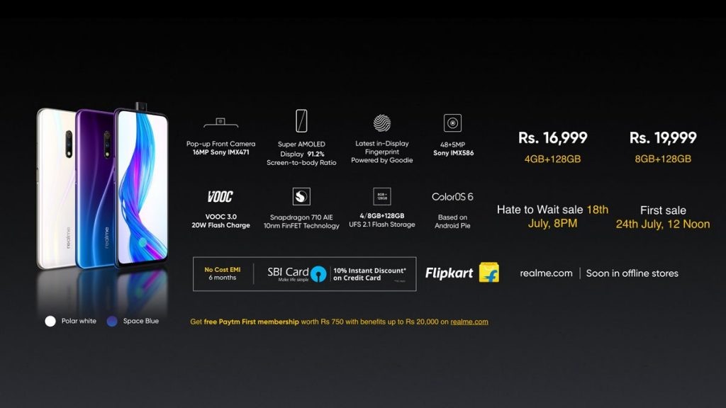 Realme X был анонсирован в Индии вместе с Realme 3i . Если вы пропустили это, компания запустила телефон в Китае, около 2 месяцев назад. Итак, вот резюме характеристик устройства. Realme X оснащен восьмиъядерным процессором Qualcomm Snapdragon 710 с 4 ГБ / 8 ГБ ОЗУ и 64 ГБ / 128 ГБ памяти. Телефон оснащен 6,53-дюймовым дисплеем Full HD + AMOLED, защищенным Corning Gorilla Glass 5, имеет соотношение экрана к телу 91,2% и оснащен сканером отпечатков пальцев. Устройство работает на ColorOS 6 на базе Android 9 Pie. Вместо камеры для селфи с выемкой или перфорацией, Realme X оснащен выдвижной фронтальной камерой с 16-мегапиксельным сенсором Sony IMX471 с диафрагмой f / 2.0. Основные камеры одинаково впечатляют благодаря 48-мегапиксельному первичному объективу с сенсором Sony IMX586, диафрагме f / 1,7 с поддержкой электронной стабилизации изображения и вторичной 5-мегапиксельной камере с диафрагмой f / 2,4. Realme X оснащен батареей емкостью 3765 мАч, которая поддерживает быструю зарядку 2