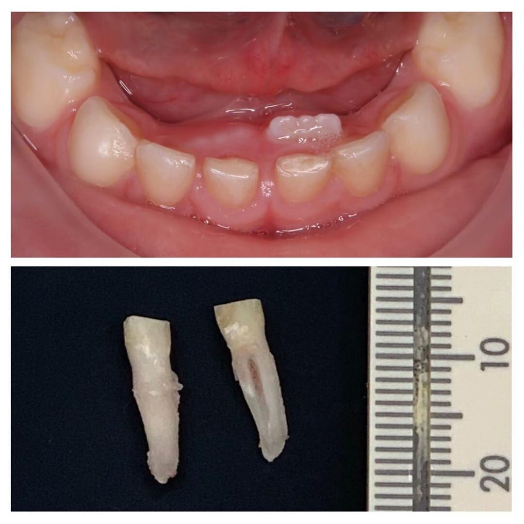 Зуб-партизан, вылез незаметно, спрятавшись за основным рядом молочных. Мальчику 5 лет. Смена зубов уже на подходе, но молочные стоят крепко и не спешат уступать место постоянным. ️Один из них незаметно пролез! Называется язычное прорезывание. Пришлось молочные удалять принудительно. На фото вы можете увидеть, какие длиннющие корни у них были. ✓Если вдруг кто забыл или не знал, напомню — у молочных зубов тоже есть корни. Под (или над) молочными зубками развиваются зачатки постоянных. К моменту смены зубов происходит «продвижение» зачатка постоянного зуба в сторону прорезывания. Этот процесс провоцирует рассасывание корня молочного зуба. Все ведь помнят, что молочные выпадают уже без корня? Они рассасываются полностью, поэтому создается впечатление и бытует заблуждение, что у молочных зубов нет корней. Они есть и весьма длинные. Случай на фото бывает, когда постоянный зуб, прорезываясь, способствует неполному рассасыванию корня. Какая-то часть корня молочного зуба, иногда совсем маленьк