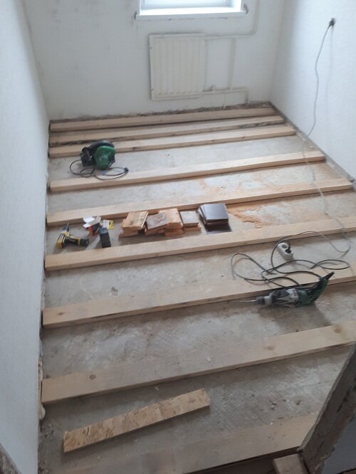 Выравнивание лаг непростая задача, ведь редко бывает, что брус идеально ровный, а плита перекрытия и подавно. Иногда отклонение от уровня составляют более 5 см. Распиливаем брус циркулярной пилой в ширину комнаты и приблизительно раскладываем по всей площади. К примеру, на один лист OSB, понадобится 4 лаги. До начала работы, подготавливаем заготовки для выравнивания лаг. Обычно я использую старую половую доску и двп. Выравниваем первую лагу, у дверного проема, по лазерному уровню. Луч лазера должен проходить по всей верхней части бруса. Сначала выравниваем края лаги, подкладывая доску и если потребуется добавляем двп. Если толщина доски больше, чем необходимо для выравнивания, нужно подтесать ее топором. Когда края лаги выравнены, продалбливаем перфоратором отверстие (используется бур по бетону, диаметром 6 мм, длиной 160 мм). Прикручиваем лагу к бетонной плите, используя нейлоновый дюбель диаметром 6 мм и саморез по дереву длиной 90 мм или 100 мм, в зависимости от высоты пол