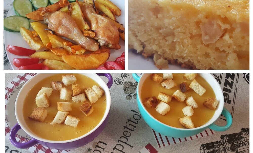 Всем привет! Сегодня поделюсь сразу тремя рецептами вкусных, сытных, экономных, легких в приготовлении блюд. Обед из трех блюд у меня получился всего за 100 рублей, а приготовила я всю эту вкуснятину за 1 час. Приступаем к приготовлению вкусного, бюджетного обеда. Начинаем с приготовления манника с яблоками. Взбиваем яйца с сахаром до появления пены, после чего добавляем манную крупу и любой жирности кефир, хорошенько перемешиваем, чтобы получилась однородная консистенция и оставляем на 30 минут, чтобы манка разбухла. Пока приготовим второе блюдо для обеда - куриные голени с картофелем, морковью в духовке. Морковь нарезаем кружочками или полукольцами, картофель дольками. В миску перекладываем нарезанный картофель, морковь, промытые, сухие куриные голени, добавляем растительное масло, по вкусу соль, черный молотый перец, приправу для курицы, хорошенько перемешиваем. Выкладываем все продукты на противень, запекаем 35 минут при температуре 200 градусов. Пока курица с картофелем гото