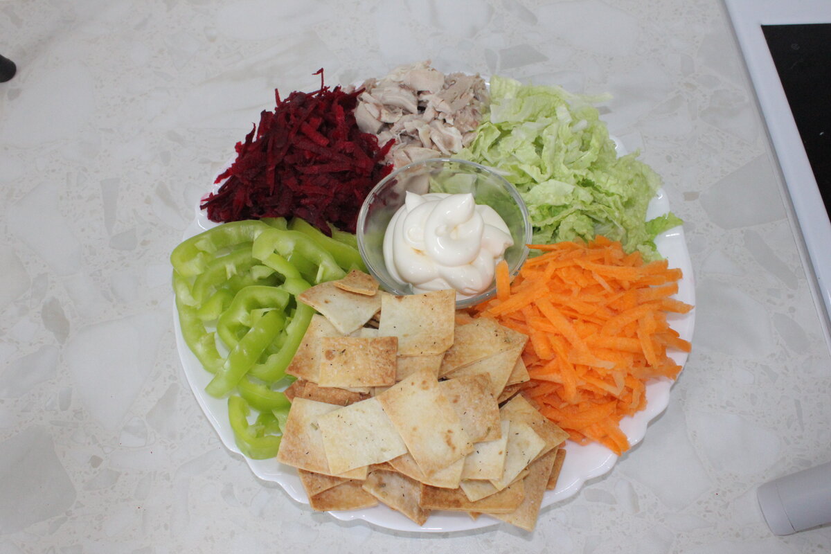 Ингредиенты: 2 моркови 1 небольшая свёкла 1 болгарский перец Капуста белокочанная 1 окорочок Чипсы любые Майонез Способ приготовления Шаг 1 Чипсы: пшеничные лепешки разрезала ножницами не сильно крупно. Сложила в целлофановый пакет, насыпала соль, черный перец и сушеный розмарин. Добавила оливковое масло, именно оно раскроет эту приправу. Ставим в разогретую духовку на 7 минут. Шаг 2 Морковь и свеклу натерла на терке для корейской моркови, перец и капусту нарезала мелкой соломкой. Окорочок отварила, отделяла от кожицы, хрящей и костей, разобрала на волокна. Чипсы немного поломала. Все уложить горочками и в середину выложить майонез (взяла домашний) Перед употреблением смешать. Приятного аппетита😘 #рецепты_светы Видео рецепт: