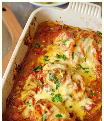 ИНГРЕДИЕНТЫ Куриная грудка 1 штука Лук ½ штуки Сладкий перец 1 штука Чеснок 1 зубчик Помидоры 1 штука Овощной бульонный кубик ½ штуки Сыр 50 г Смесь итальянских трав по вкусу Вода 1,5 столовые ложки Сливки 1,5 столовые ложки Оливковое масло по вкусу Мускатный орех щепотка Соль по вкусу Сливочное масло по вкусу Перец черный молотый по вкусу ИНСТРУКЦИЯ ПРИГОТОВЛЕНИЯ 1. Нарежьте болгарский перец кольцами (лучше выбрать трех разных цветов — это выглядит красочнее), предварительно удалив семена. Лук нарезать полукольцами, чеснок натереть на мелкой терке. 2. Куриные грудки посолить, поперчить. В комбинации 2 столовые ложки оливкового и 1 столовая ложка сливочного масла, обжарить грудки до золотистой корочки. Переложить в форму для духовки.