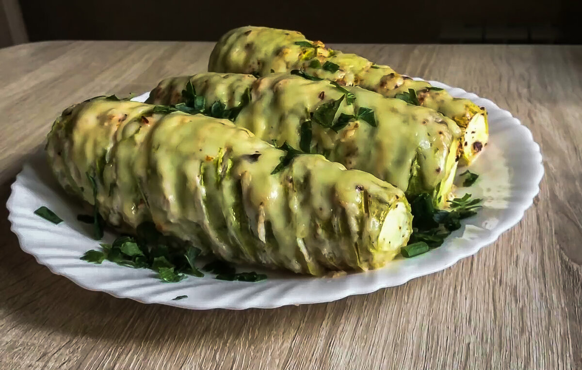 Всем привет, поделюсь с вами рецептом очень вкусных а главное простый в приготовлении кабачков. Итак что нам нужно: Кабачки ставим между двумя маркерами (можете взять что-то другое) и нарезаем таким образом Затем переворачиваем и снова нарезаем У Вас должна получиться такая "гармошка" Измельчённый лук, соль и перец смешиваем с куриным фаршем Запихиваем его в кабачки как на картинке Чашечку воды, 1 ст. ложку сметаны и 1/2 сл. паприки смешиваем до получения однородной консистенции Заливаем кабачки этим соусом и ставим в духовку на 180 градусов на 30-35 минут За 5 минут до готовности посыпаем измельчённым сыром И всё готово. Приятного аппетита! Подписывайтесь на канал и ставьте лайки, и будет ещё больше рецептов.