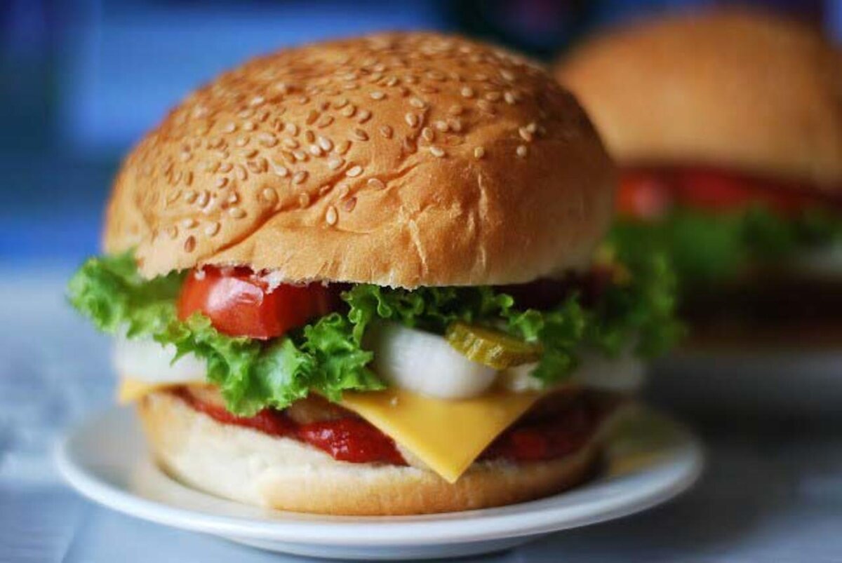 - Разрежьте булки напополам, положите нижнюю часть на тарелку и приступайте к формированию бургера: вниз отправляется котлета, смазанная кетчупом и горчицей, на соусы кладутся куски огурцов, кольца лука, по листу салата, ломтику сыра и свежего помидора. Закройте верхней частью булки, и не забудьте про «секретный ингредиент» — любовь. Готово!