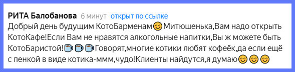 Я рассказал в своей прошлой записи (здесь) про то, как я чуть было не решил стать барменом, но передумал. И вот мне только что тётя Рита посоветовала хорошую идею - лучше стать баристой и открыть котокафе!!! Я увидел в телефоне хозяйке вчерашнее видео и я теперь знаю, что одна потенциальная клиентка у меня уже можно сказать есть!!! Это тётя (кошка) Маруся: Теперь я еще более точно подумываю открыть котокофейню и там у меня будет правильный кофе, в нем будет много-много молока или сметаны 🐈 А я еще вот подумал, можно же и алкогольный кофе делать, типа "Irish Coffee", но туда не виски добавлять, а валерьянку 🙀😺👍 А тётю Риту я бесплатно буду угощать - она мне такую хорошую идею подала!!! 😻