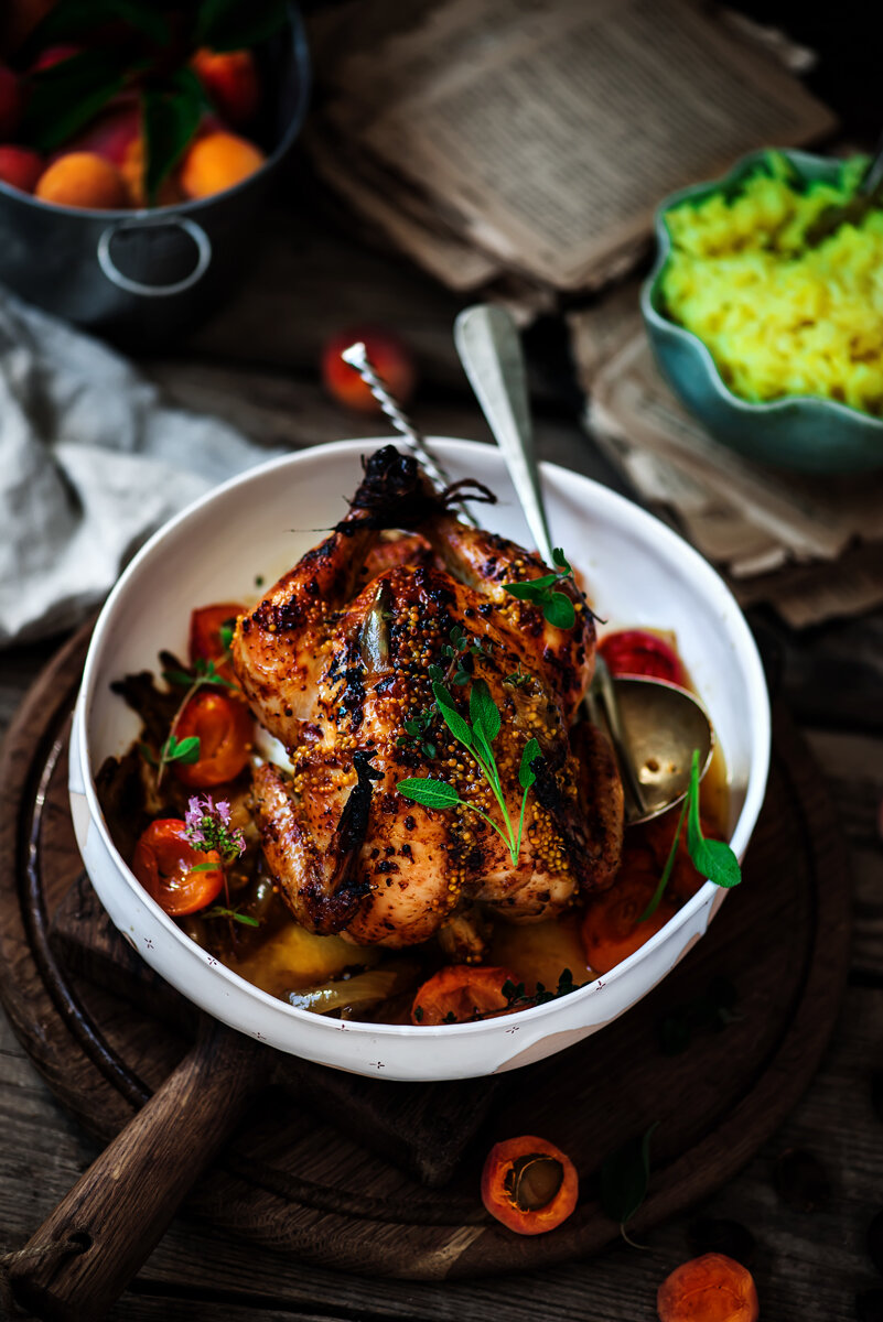 - Положить к цыплятам половинки абрикос и запекать еще 10 минут.