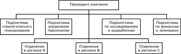 Если деятельность компании распространена на несколько регионов, в которых требуется использование различных стратегий, то целесообразно формировать дивизиональную структуру управления по территориальному принципу, т. е. применять дивизионально-региональную структуру (см. рис. 6). Вся деятельность компании в определенном регионе в этом случае должна подчиняться соответствующему руководителю, несущему за нее ответственность перед высшим руководящим органом фирмы. Дивизионально-региональная структура облегчает решение проблем, связанных с местными обычаями, особенностями законодательства и социально-экономической среды региона.