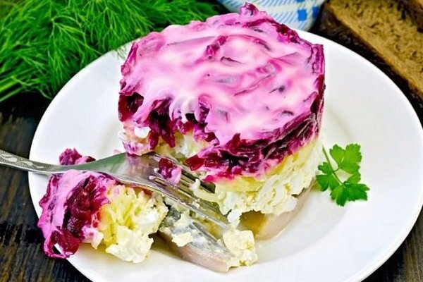 Классическую, всем известную сельдь можно разнообразить, добавив в салат яблоко. В зависимости от размера порции, возьмите ингредиенты в равных пропорциях. На среднюю порцию понадобятся следующие продукты: • Сельдь слабой соли – 200 грамм • Свёкла – 1 крупная штука • Морковь – 1 средняя • Картофель – 2 средних клубня • Яблоко – 1-2 штуки. Также нам понадобится: Майонез, лук-репка, соль и перец по вкусу. Переходим к приготовлению: 1. Сварите, остудите и очистите овощи. 2. Нарежьте ровными кубиками либо натрите овощи с помощью тёрки. 3. Удалите лишний сок из свёклы. 4. Мелко нарежьте лук, яблоко и селёдку. 5. На сервировочное блюдо выкладывайте ингредиенты слоями в следующей последовательности: картофель, морковь, филе сельди, лук, яблоко, свёкла. Каждый слой промажьте майонезом, солите и перчите по вкусу. 6. Можно украсить салат узором их майонеза и свежей зеленью. Приятного аппетита!