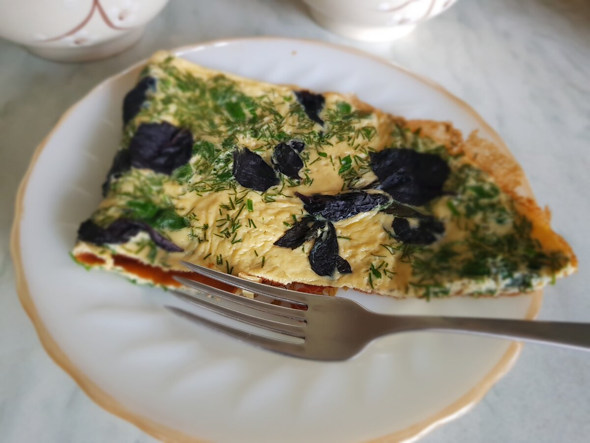 Быстрый и очень простой завтрак. Хорошо подойдёт для тех, кто придерживается правильного питания. Как вариант, можно использовать в качестве перекуса. Готовила для себя и мужа, поэтому в рецепте все составляющие будут указаны из рассчёта на две персоны. Ингредиенты: По желанию, можно добавить ещё зелёный лук, 1-2 зубчика чеснока и помидорки черри, нарезанные половинками, а зелень заменить шпинатом (у меня на тот момент, к сожалению, ничего этого не было, поэтому ограничилась только петрушкой и укропом☹). Приготовление: 1. Зелень и базилик промываем, просушиваем. Ставим на плиту сковороду с антипригарным покрытием, когда разогреется - убавляем нагрев до половины; 2. У базилика отделяем листики от стебельков, откладываем в сторону. У зелени убираем толстые стебельки, мелко нарезаем; 3. Разбиваем яйца в ёмкость для смешивания, добавляем к ним соевый соус; 4. Добавляем в ёмкость для смешивания молоко; 5. Тщательно смешиваем вилкой/венчиком/блендером; 6. Кладём в смесь зелень, перемешиваем