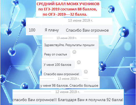 В этой статье я хочу поделиться своими соображениями по актуальнейшему для каждого выпускника и его родителей вопросу - от чего зависит успех при сдаче экзамена по химии. Думаю, что мне есть,что сказать по этому вопросу, хотя бы потому, что средний балл моих учеников по ЕГЭ (онлайн-репетиторство) в этом году составил 88 баллов : 100, 100, 98, 98, 92, 80, 73, 60. По ОГЭ - практически все (6 человек) - 32-33 балла. На этом слайде показаны выдержки только из некоторых высказываний моих учеников сразу после получения результатов: