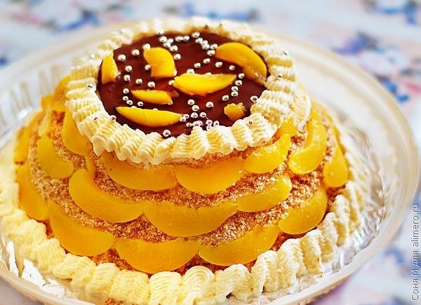 Этот тортик я готовила ко дню рождения моей бабушки. Пожелания от именинницы были такими: торт не должен был быть слишком сладким и жирным, в начинке побольше различных фруктов и ягод. Торт Признаюсь, я слегка облегчила себе жизнь и купила готовые бисквитные коржи диаметром 26 см. Но можно было выпечь 4 тонких бисквита на сметане (коржи должны быть плотными, чтобы держать начинку, её в торте много). По этой же причине коржи не смачиваются сиропом — под весом начинки влажные коржики расползутся. К тому же влага из начинки пропитает за ночь бисквиты, этого будет достаточно, чтобы тортик был мягким и нежным. В тортике три различных начинки желеподобной консистенции: творожно-апельсиновая на желатине, сливочно-шоколадная на муке и фруктово-ягодная на крахмале. Готовим первую начинку: 150 г творога 150 г сливок 33-35% 20 гр. желатина (у меня было апельсиновое желе в пачке) цедра половинки апельсина сахар по вкусу несколько долек консервированных персиков Торт Разводим желатин, даем нас